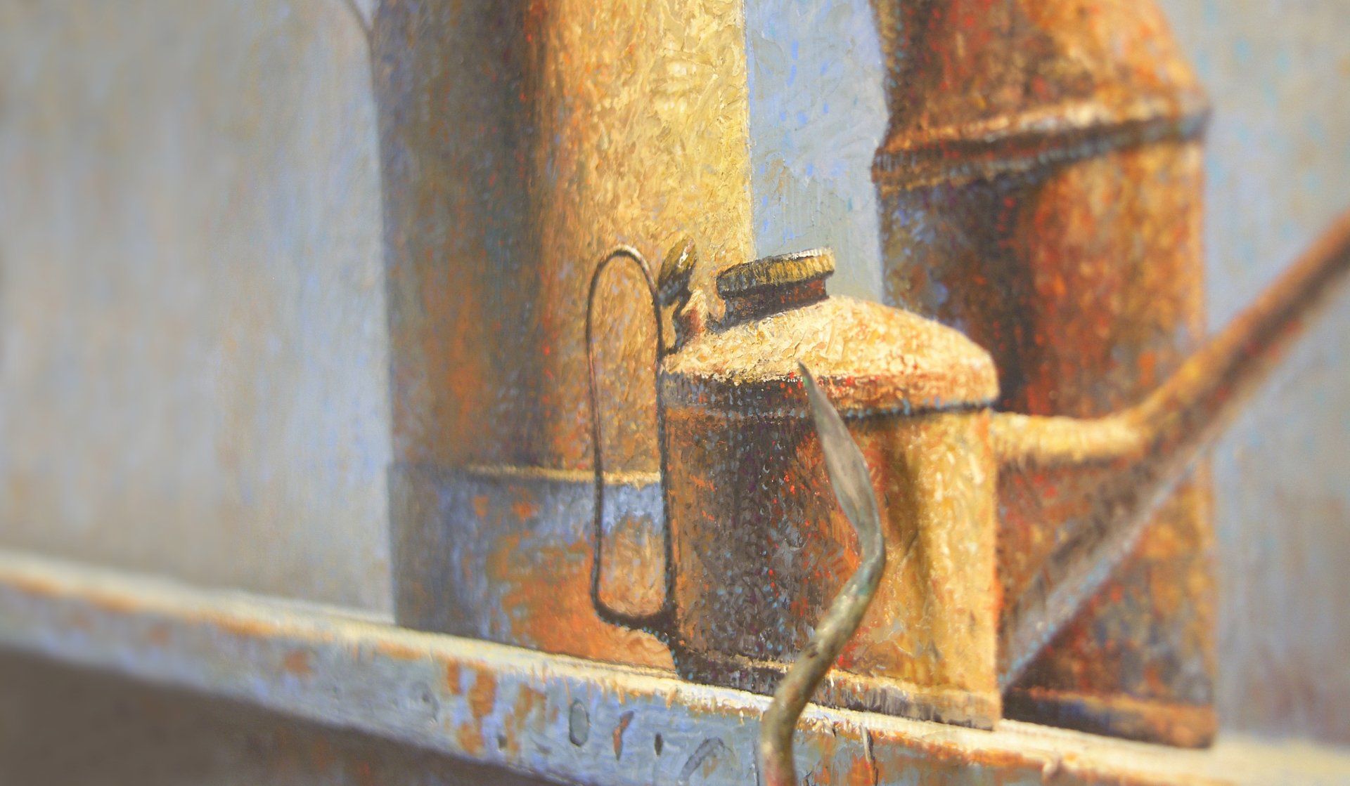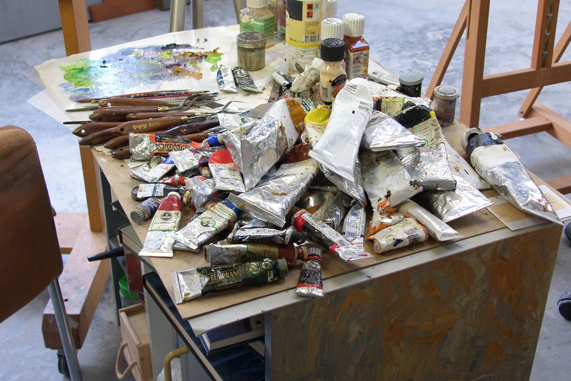 Wie goed naar de schilderijen kijkt ziet al snel mijn voorkeur voor strakke composities verwant aan die van Mondriaan. De vlakverdeling en het terugbrengen van diepte naar platte vlakken (welke soms op abstracte schilderijen lijken) geven de schilderijen een eigentijdse indruk. Oude verweerde materialen en voorwerpen hebben mijn voorkeur omdat ze vaak zo rijk aan mooie kleuren en structuren zijn.