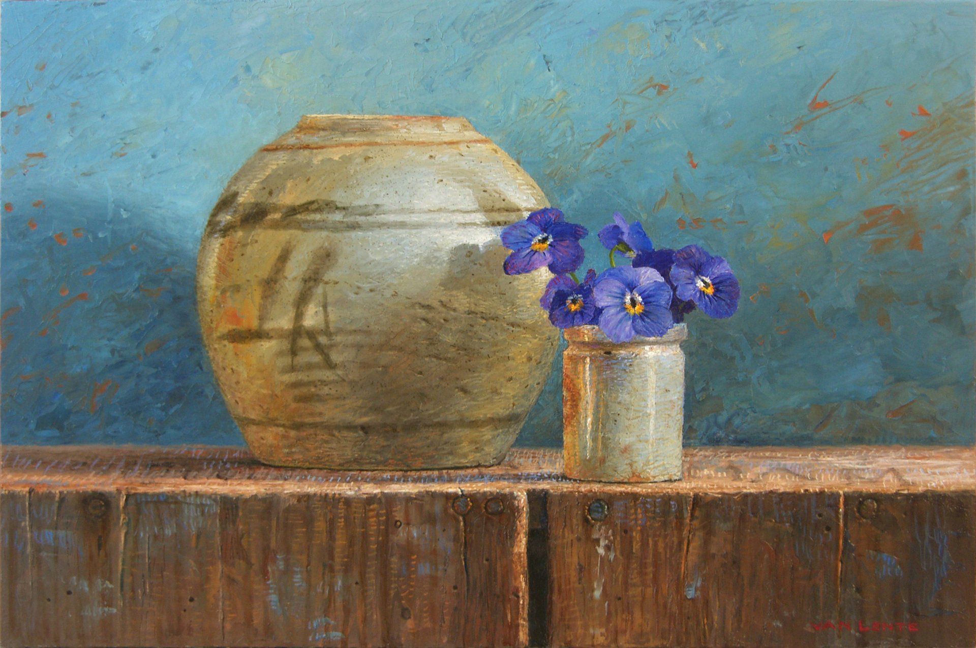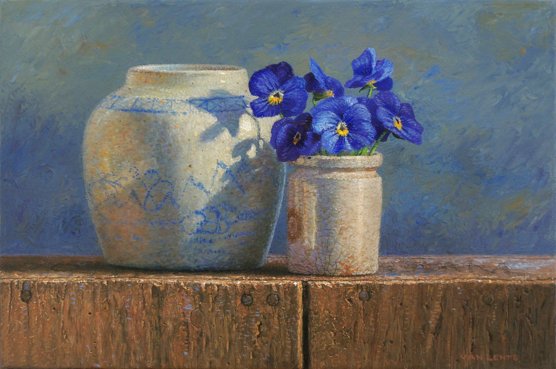 blauwe viooltjes en gemberpot | olieverf paneel | 30 x 20 cm