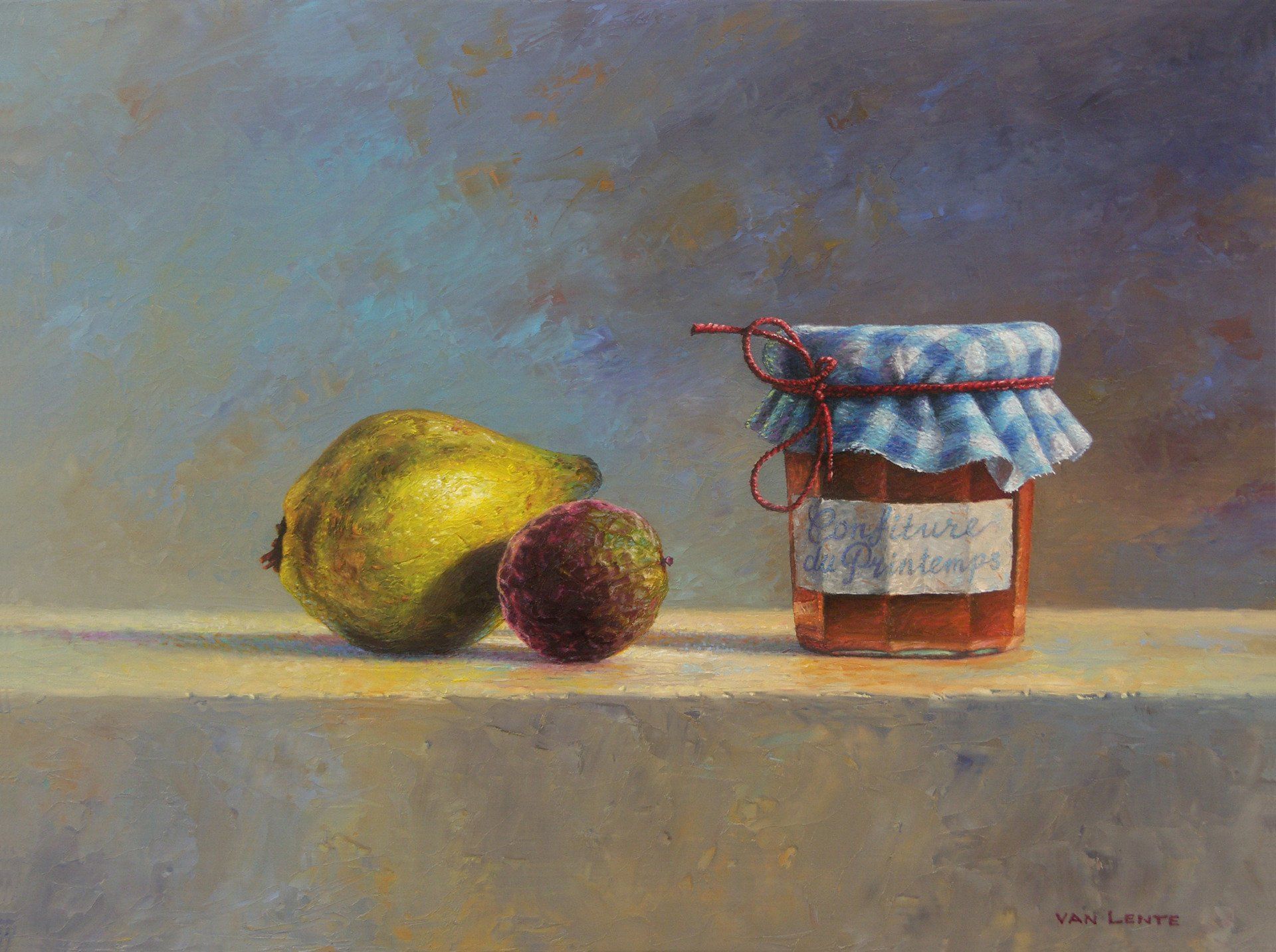 peren en lichtblauw schaaltje | olieverf paneel | 30 x 40 cm