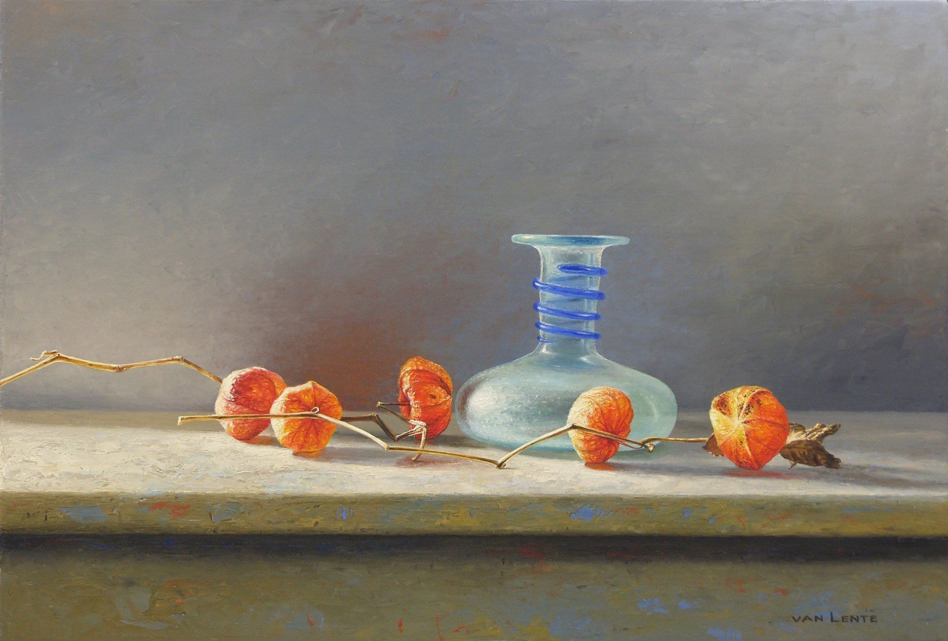 physalis en romeinse fles | olieverf paneel | 40 x 30 cm