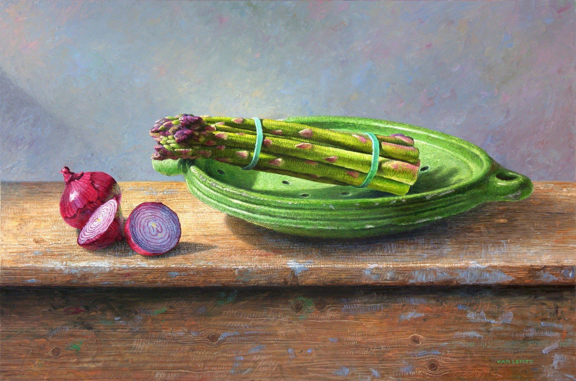 groene asperges met rode uien | olieverf paneel | 40 x 60 cm