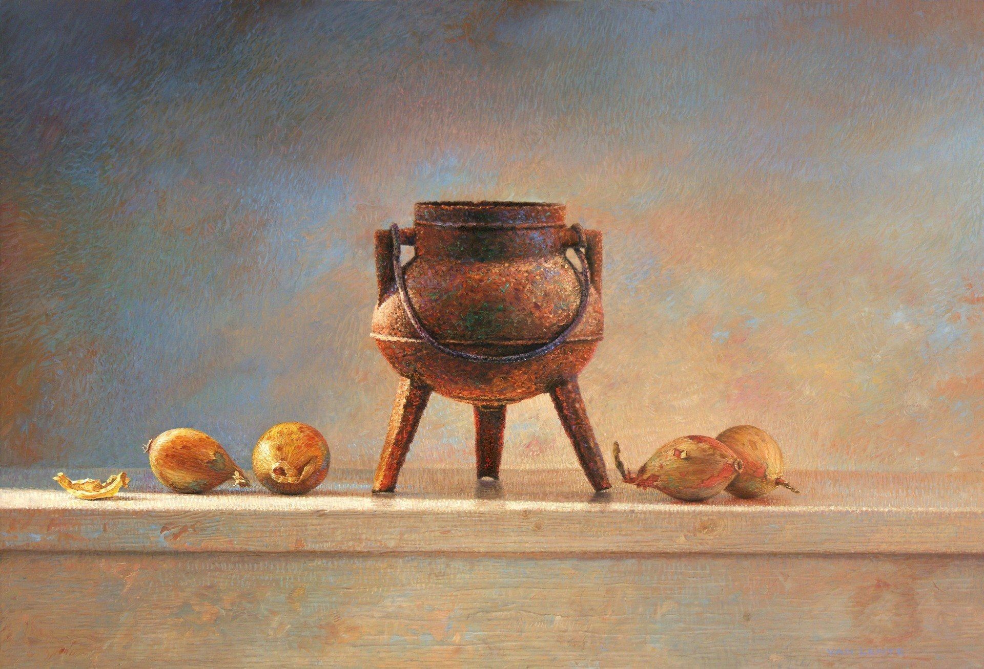 kookpot met uien | olieverf paneel | 40 x 60 cm