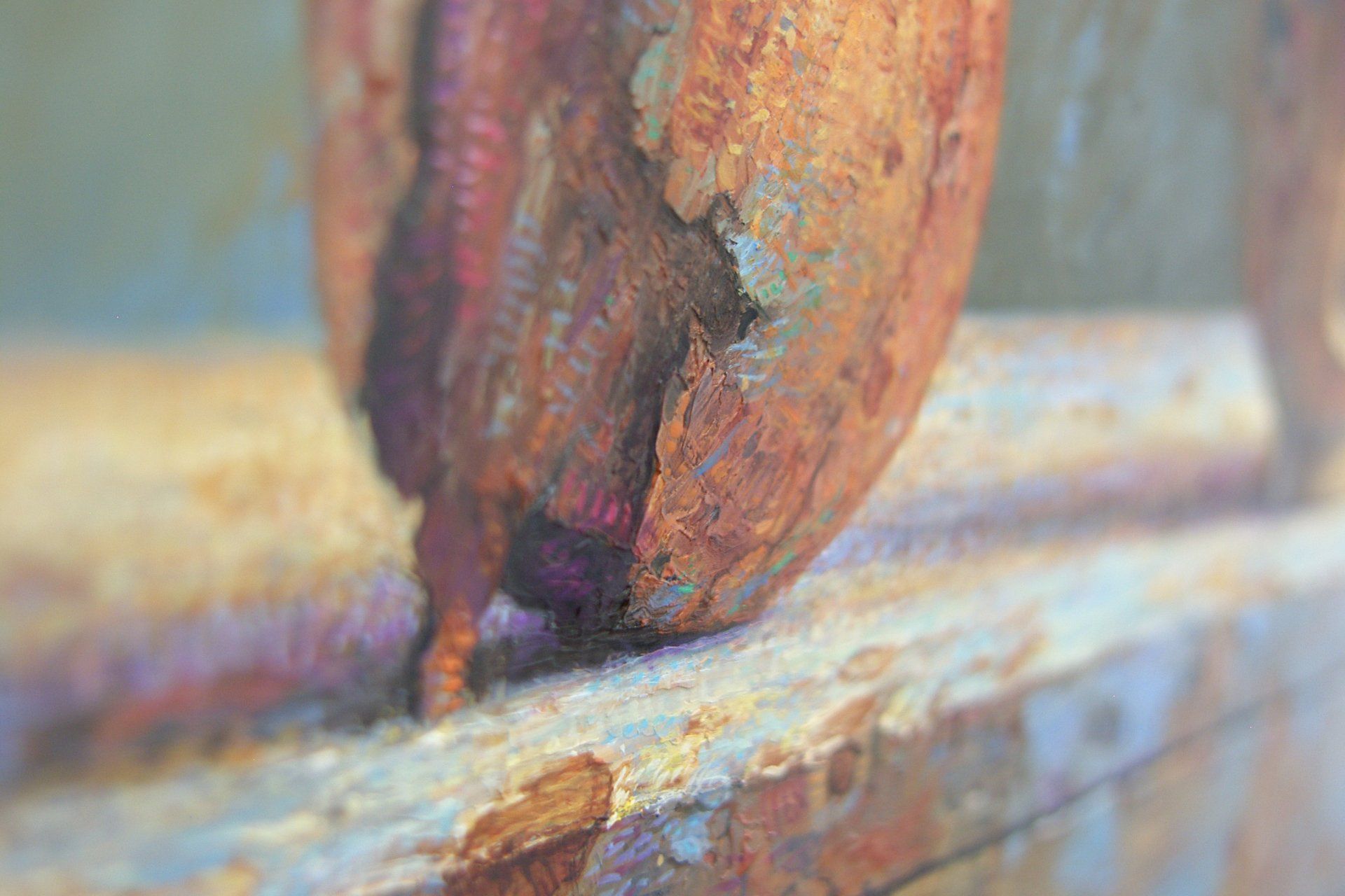Wie goed naar de schilderijen kijkt ziet al snel mijn voorkeur voor strakke composities verwant aan die van Mondriaan. De vlakverdeling en het terugbrengen van diepte naar platte vlakken (welke soms op abstracte schilderijen lijken) geven de schilderijen een eigentijdse indruk. Oude verweerde materialen en voorwerpen hebben mijn voorkeur omdat ze vaak zo rijk aan mooie kleuren en structuren zijn.