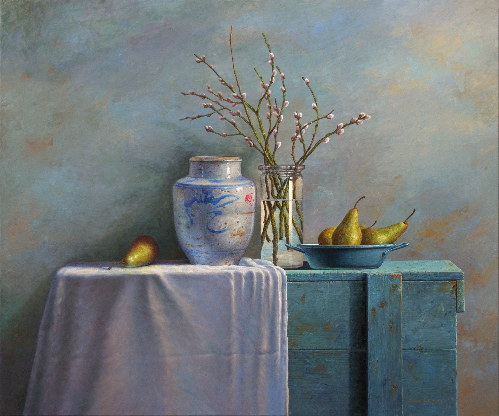 groene kruik en blauwe pruimen | olieverf linnen | 90 x 100 cm