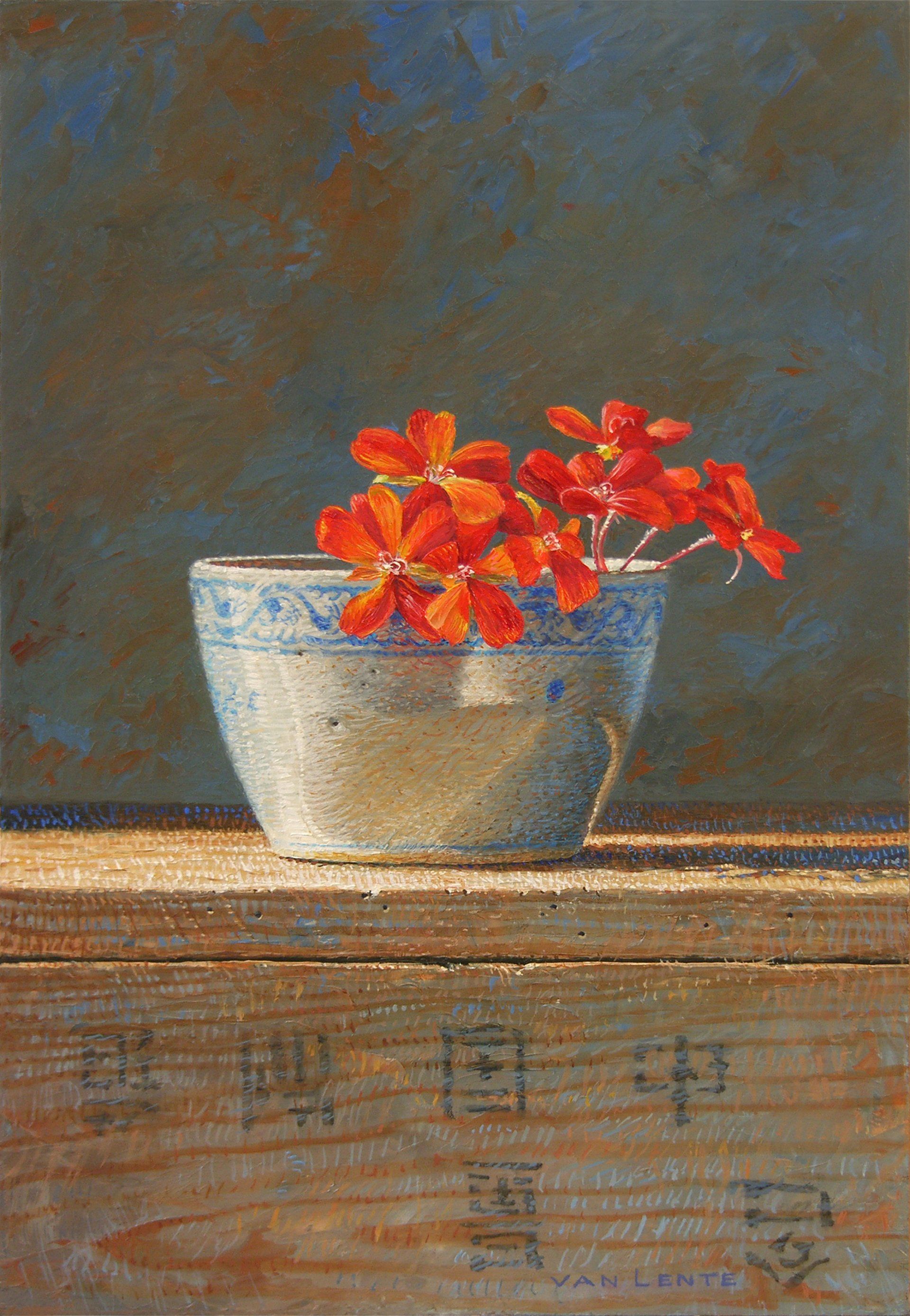 chinese kom met geranium | olieverf paneel | 30 X 20cm