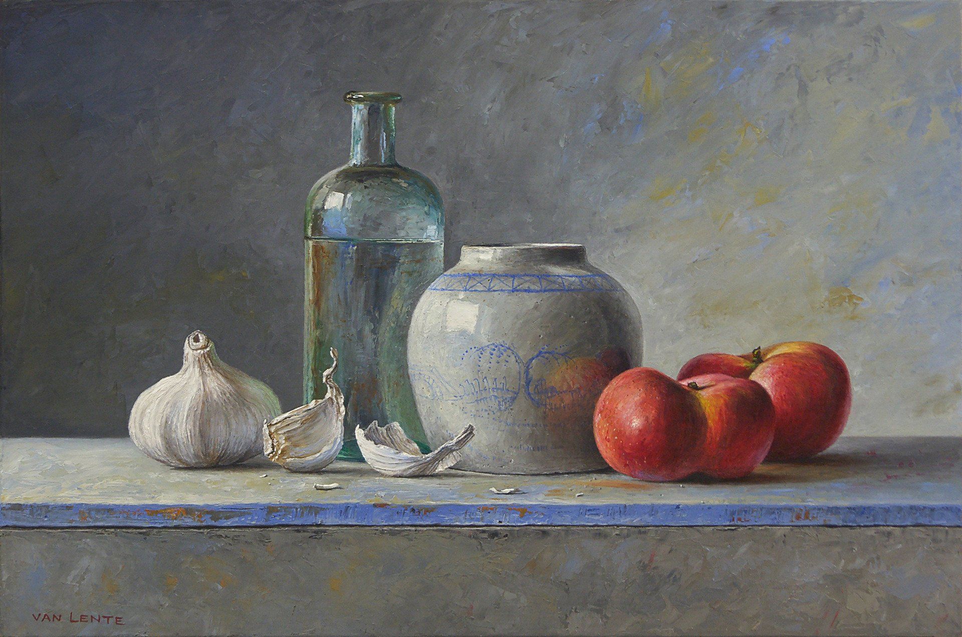 knoflook en wilde perzik | olieverf paneel | 32 x 47 cm