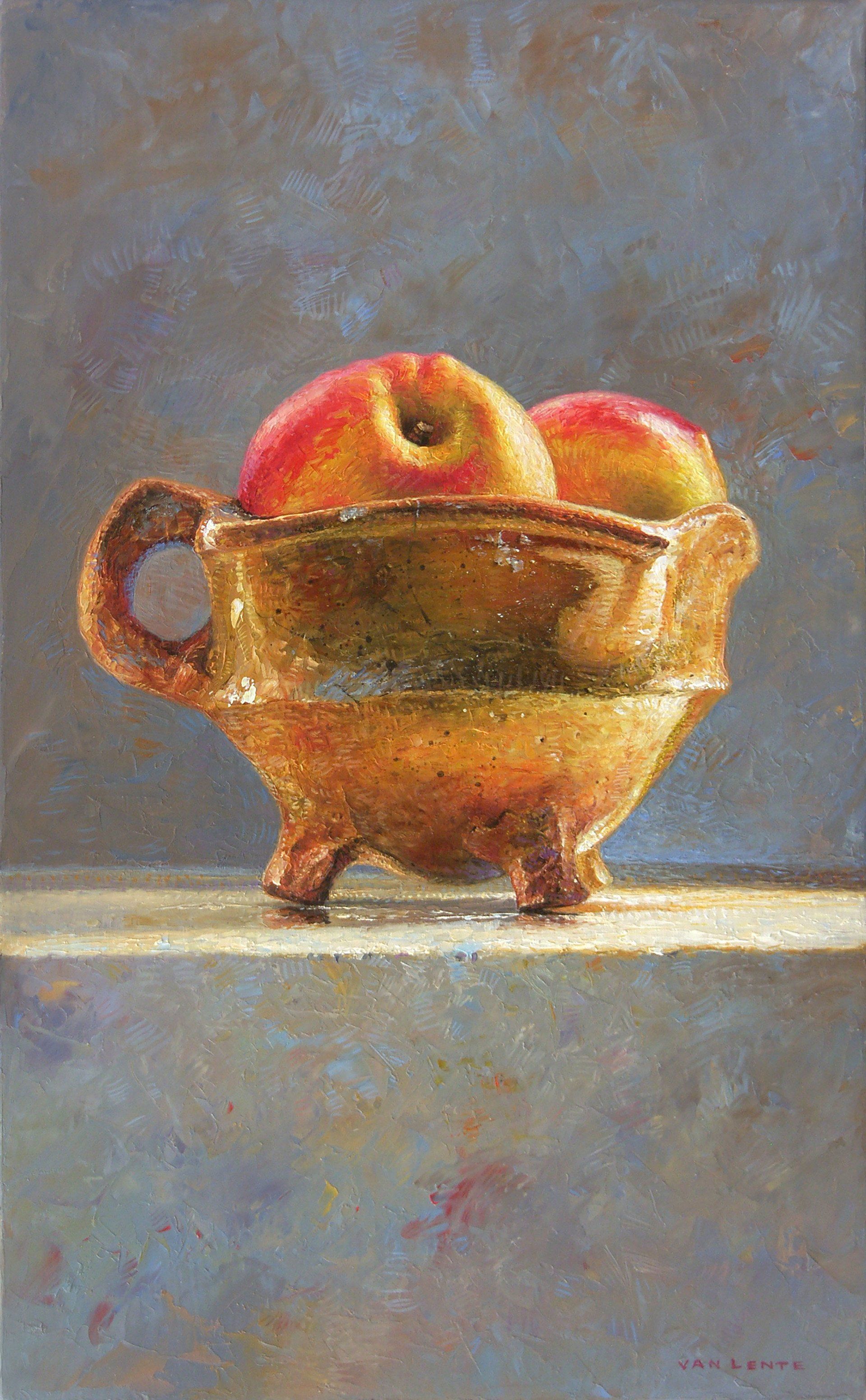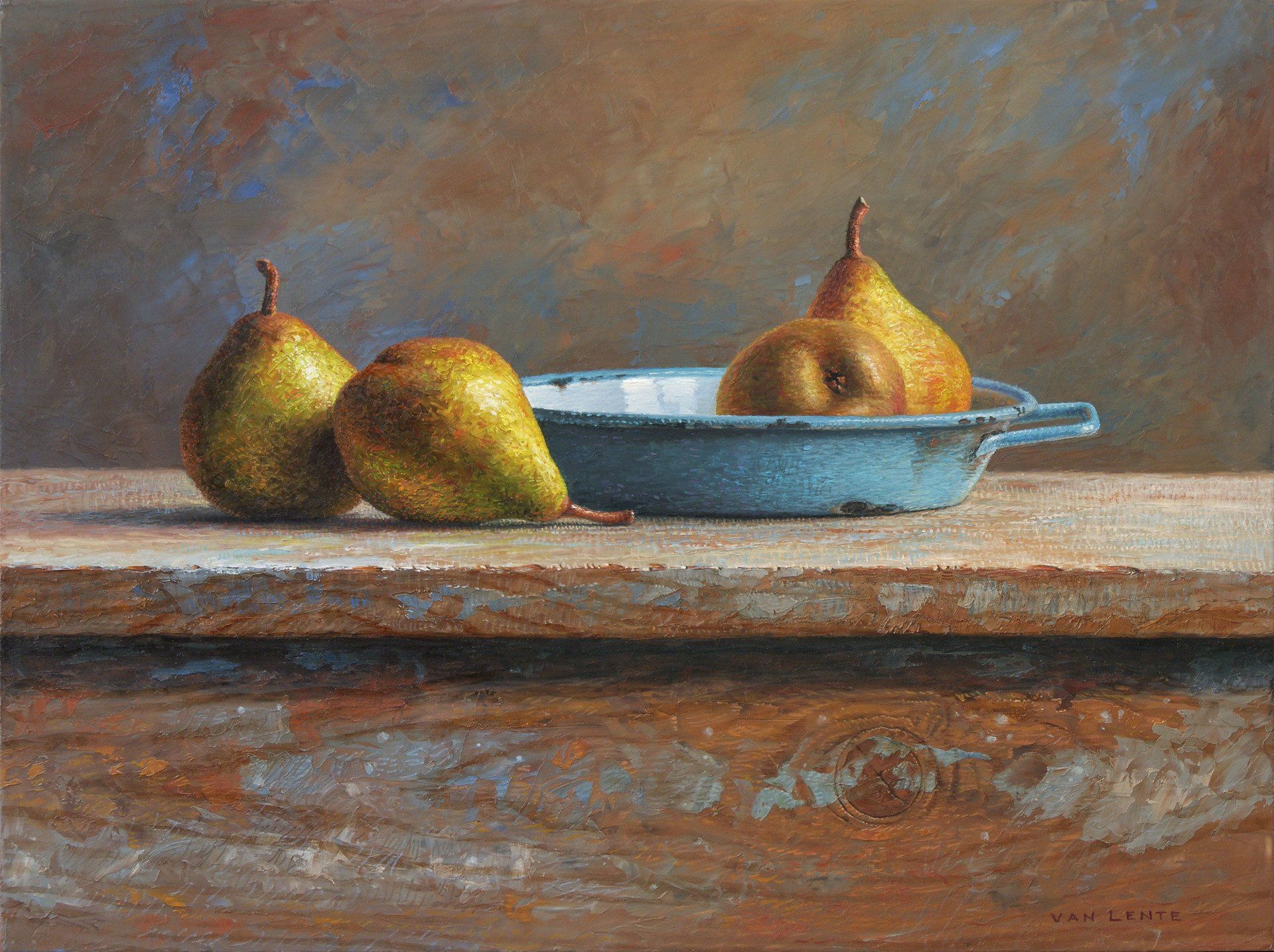 peren en lichtblauw schaaltje | olieverf paneel | 30 x 40 cm