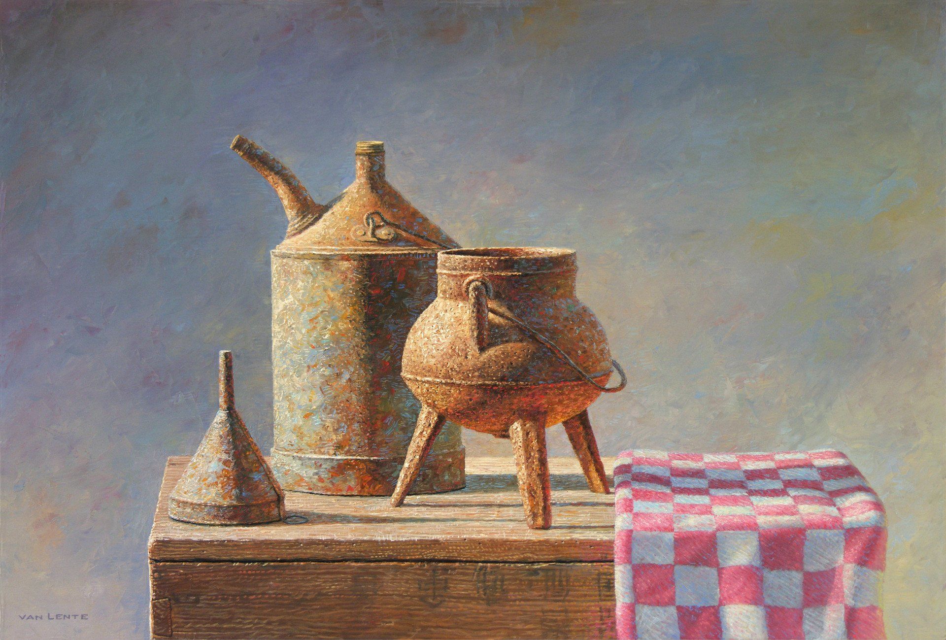 kookpot met oliekan en trechter | olieverf paneel | 40 x 60 cm